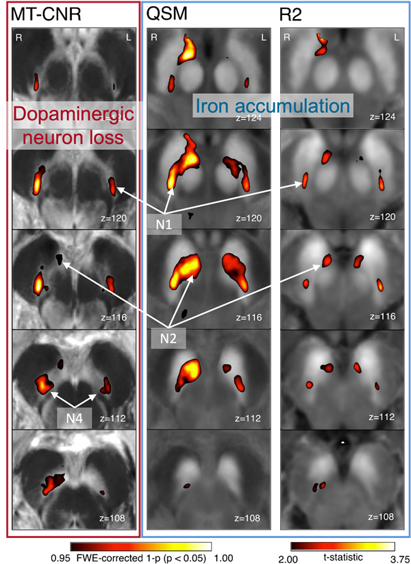 The large majority of dopamine neurons are situated in two midbrain nuclei, the ventral tegmental area (VTA) and the substantia nigra pars compacta (SNc). Using high resolution imaging, we can show that dopaminergic neuron loss and iron accumulation in the SNc show an overlapping, but also spatially distinct disease pattern with highest disease sensitivity in the nigrosomes 1, 2 and 4 (Madelung et al. 2025).