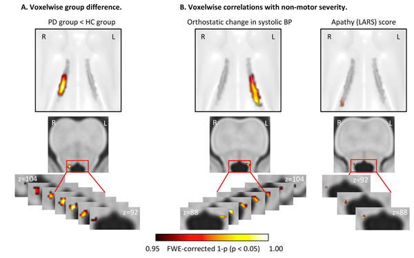 The locus coeruleus (LC), a small nucleus in the brain stem, is the main source of noradrenergic projection neurons and it is also heavily affected by neurodegeneration in PD. Noradrenaline lies at the core of eliciting an arousal response to novel and surprising events and has a tight coupling to the sympathetic nervous system. We can show that the LC does not degenerate uniformly and that cell death in different parts of the structure correlate with different non-motor symptoms (Madelung et al. 2022).