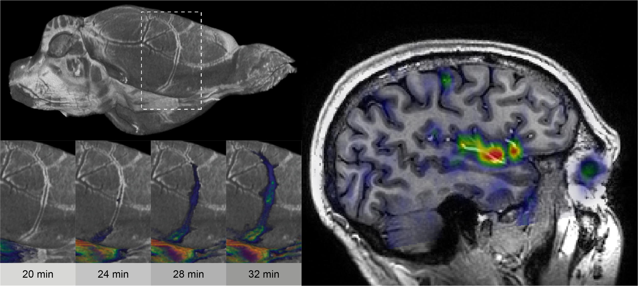 Glymphatic cerebrospinal fluid flow in pial perivascular spaces of the middle cerebral artery visualized with dynamic MRI of a paramagnetic tracer in the rat brain (left) and low b-value dynamic diffusion imaging in the human brain (right).