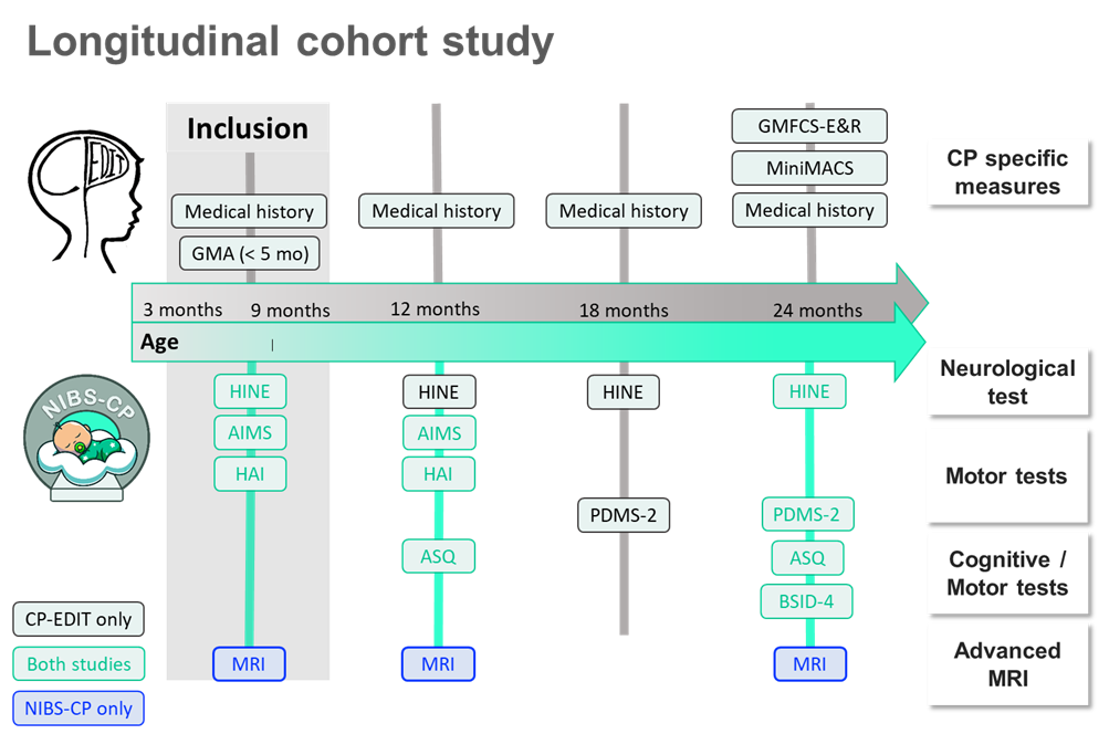 Outline of the NIBS-CP study and CP-EDIT. All children will undergo MRI scans three times over a 2-year-period, from ages 3 to 24 months. At baseline (age 3-9 months), children will be assessed with the Hammersmith Infant Neurological Examination (HINE), the Hand Assessments for Infants (HAI), and the Alberta Infant Motor Scale (AIMS). At the first follow-up (age 11-12 months), the children will be re-assessed with AIMS and HAI, as well as with the Ages & Stages Questionnaire (ASQ). Additionally, children at risk of CP will be re-assessed with the HINE. At the second follow-up (age 24 months), all children will be assessed with HINE, Peabody Developmental Motor Scales (PDMS-2), ASQ, and the Bayley Scales of Infant and Toddler Development 4th Edition (BSID-IV).