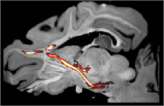 This dataset has been used for validation of probabilistic tractography agains two simultaneously injected in vivo invasive tracers: Manganese and BDA, as described in Dyrby et al 2007. Therefore the dataset is suitable for testing of existing or new fibre reconstruction models and tractography methods. The dataset available for download is that referred to as “pig1” in Dyrby et al 2007 and the pig brain shown in Figure 7 of Dyrby et al 2011. The original tracer data is available for collaborators only.